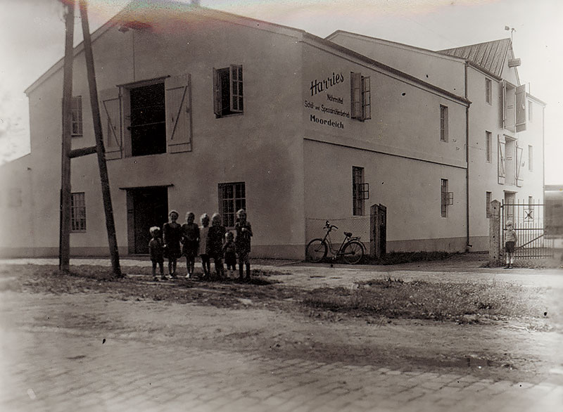 Die Harries-Mühle wird gegründet. Bernhard Harries übernimmt die Wind- und Dampfmühle in Sannum bei Huntlosen in Oldenburg. Noch im selben Jahr Grundstückskauf in Moordeich, wo eine neue Mühle erbaut wird.